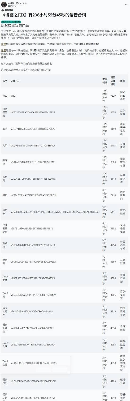 这位粉丝从游戏数据里提取出了所有语音文件,还对整个存档做了梳理。经统计,一共有173642个语音文件,涉及大约2068名角色。此外,他还整理出了每名角色的总语音时长、台词数量以及对应的配音演员信息。