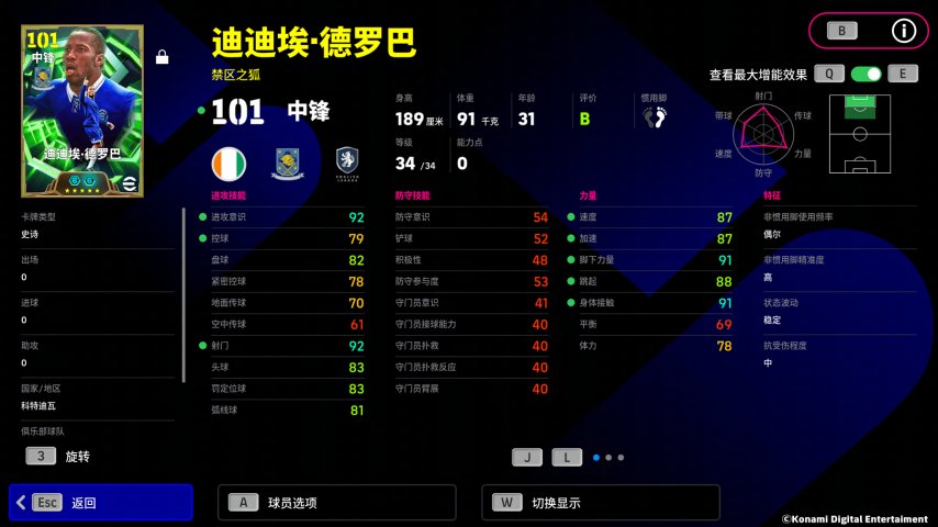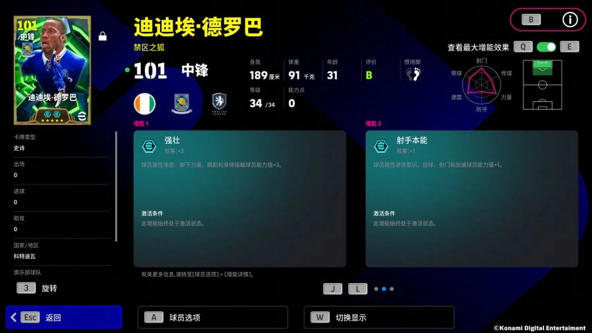 德罗巴的增能属性是【强壮 +3】,速度与身体接触的提升,让他那如同合金浇筑的身躯在进攻途中可以碾压所有阻碍!他拥有【无定型射门】的特殊技巧,即便背对球门,也能在转瞬之间拧身完成爆射破门!此外,他还自带【到位传球】的特殊技巧,总能送出手术刀般精准的传球,为队友创造得分良机!