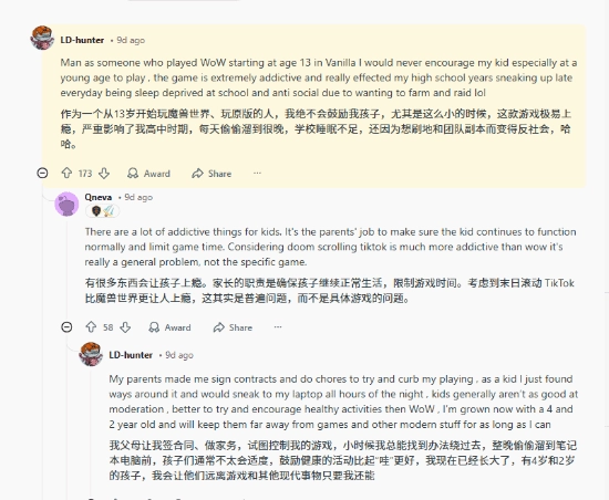 用户LD-hunter回想起自己13岁时痴迷《魔兽世界》的日子:“那时候我总熬夜玩游戏,上学天天睡不醒,还老找借口躲着人,就为了能回去刷怪、打团本……爸妈逼我签‘游戏协议’,让我做家务换玩游戏的时间,可我还是会半夜偷偷爬起来玩。”现在已经是两个年幼孩子父亲的他坦言:“我绝对不会让4岁和2岁的孩子这么早就接触这类游戏。”