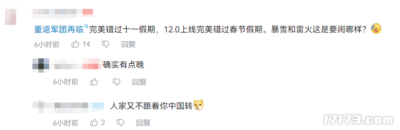 让国服玩家感到郁闷的是,继《军团再临》Remix版本完美避开国庆假期后,12.0版本又确定在元宵节当天上线,再一次与春节长假擦肩而过,想要尽情投入游戏的玩家也只能提前请假了。
