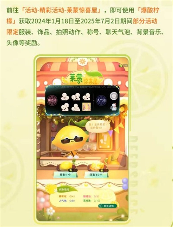 「莱蒙惊喜屋」是游戏内的常驻活动。玩家在游玩过程中完成特定的活跃任务后,就能获取新道具“爆酸柠檬”,随后可利用该道具与角色莱蒙进行交互交易,以此兑换相应的奖励。该活动没有设定结束时间,玩家可以持续积累参与。