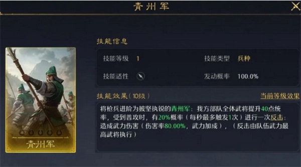这是枪兵的专属兵种技能,它能提升反击次数并增加统率值,还能同时实现增伤与减伤的效果,是组建枪兵反击队时不可或缺的核心技能。