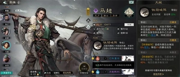 一、天赋技能【铁骑破阵】:对敌方随机一列单位造成伤害,同时提升自身与己方武力最高的其他单位5%暴击率,效果持续2回合。
