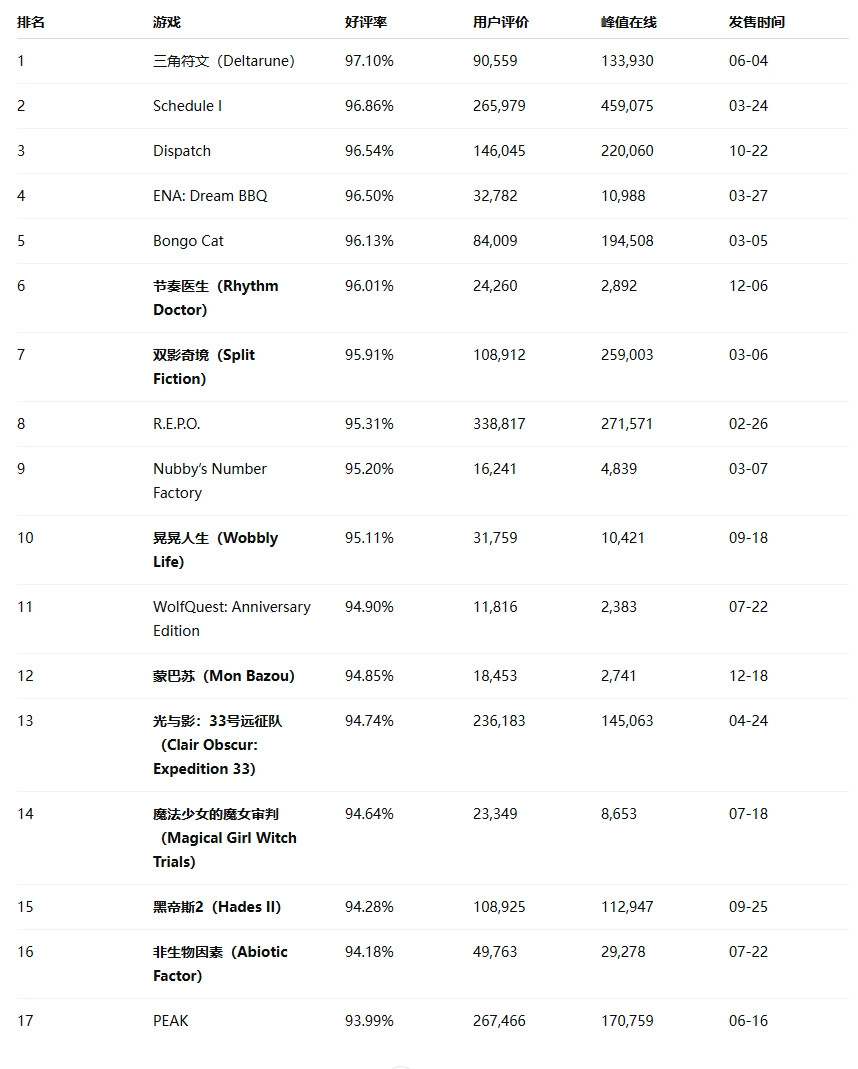 SteamDB公布了2025年Steam平台上评分最高的17款新游戏,入选的这些刚发售的作品,用户评价数量均突破1万条,且好评率都达到了93%以上。