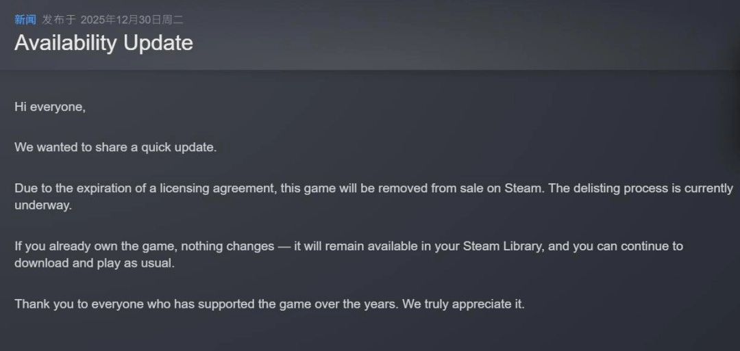 开发商Conatus Creative Inc.在一则突然发布的Steam更新公告中表示:“因授权协议到期,这款游戏将在Steam平台停止售卖,目前下架流程已正式启动。”