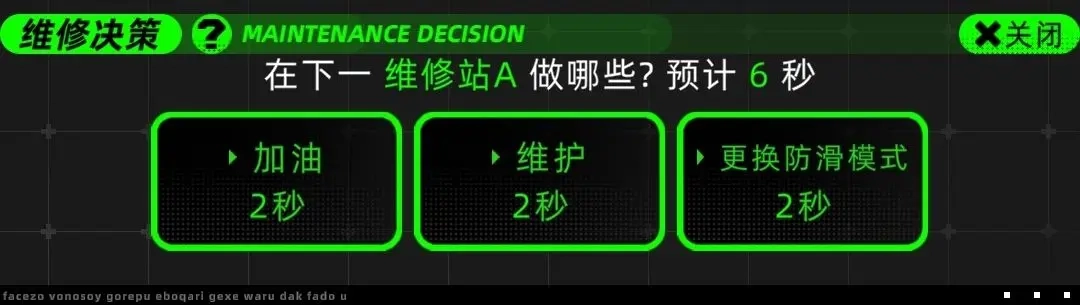 比赛前期若油量不足,建议赛车手切换至节能模式;进站时需选择加油与维修服务,并密切关注天气变化。到了比赛后期,则应启用加速模式,中途进站同样要进行加油和维修操作。记得为车辆安装已研究完成的图纸插件,维修决策方面,可根据实际情况选择全选、单选或不选。