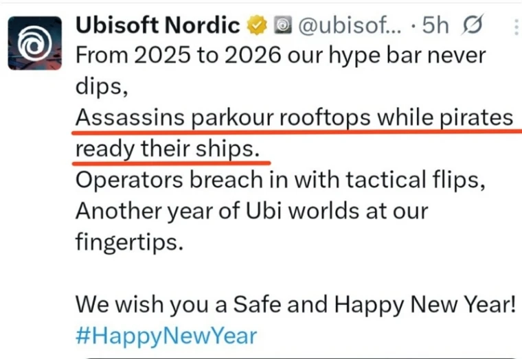 近日,育碧在发布的元旦祝贺内容里,悄悄透露出《刺客信条4:黑旗重制版》的相关消息。开发团队在节日祝福中提到“海盗们正在准备他们的船只”,这一说法很可能是官方在间接确认重制版项目正顺利推进。
