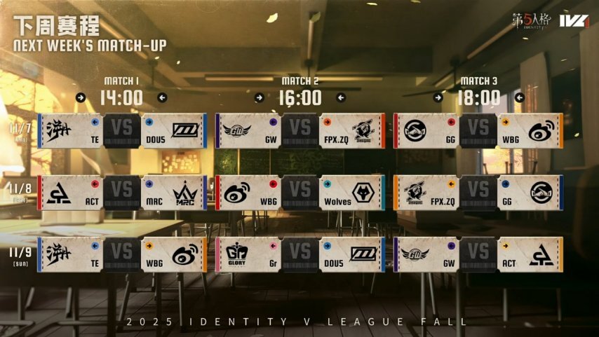 新一轮的交锋已然拉开帷幕,面对过往交手过的对手,谁能扭转局势、谁又能延续亮眼表现?北京WBG战队三场关键对决即将打响,将与积分榜前列的强敌依次交锋。越是旗鼓相当的对抗,越能凸显战术层面的较量,他们能否在连续对战中稳住态势?请锁定11月7日14:00第五人格赛事直播间,共同期待选手们的精彩发挥!