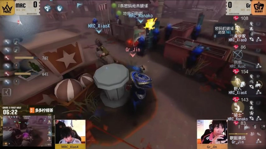 第三天MRC对阵Gr的第二局上半场,Gr_Jin操控的歌剧演员开局就朝着月亮河公园的马戏团方向进发,向MRC_HuaC的病患发起进攻。MRC_HuaC在两板一窗的区域放下木板,形成了封闭的长窗地形;Gr_Jin则从外侧向内压缩病患使用钩爪的空间,在站台连接处的板区果断打断了病患的影跃,借助加速效果跃至板前完成抽刀。MRC_HuaC随即用钩爪跳上站台迂回,但在Gr_Jin精湛的追击技巧下,不到一分钟就被击倒淘汰。 由于前期出现了失误,淘汰一人后场上还剩两台完整的密码机未破译。Gr_Jin切换底牌为传送,寻找针对MRC_XiaoD的第二波节奏。MRC_XiaoD操控气象学家,先利用强风技能拉开身位,再用层云缩短与起点站的距离,挨了一刀后坐上过山车,尽可能延长牵制时间,最终在死木马前的板区被击倒。 MRC_Nanako的“骑士”赶来救援,凭借荣誉守护特质,气象学家得以继续坐过山车牵制;监管者也果断转追“骑士”,并压住了遗产机。气象学家脱离牵制后,在外围直接开启新的密码机。Gr_Jin将“骑士”挂上椅子后,传送至马戏团对MRC_XiaoD进行轻微压迫,随后回溯到椅子前守椅。MRC_XiaoX的野人救下“骑士”后,立刻骑乘野猪进行ob,利用箱子和树构成的独立建筑与歌剧演员周旋——因周边没有影域供歌剧演员触发影跃加速,一时难以解决野人,只能被迫拖延时间。 随着外面密码机进度的压力增大,且预判野人骑乘时间即将结束,监管者强行牵起“骑士”;MRC_XiaoX则利用最后一丝骑乘时间,精准抓住牵气球的瞬间将人撞救下来,配合“骑士”盖板,成功将密码机拖到压好的状态,最终双方战平。 本局中,MRC的求生者凭借极强的韧性,以及MRC_XiaoX对野人克制歌剧演员的深刻理解,人尽其才发挥了关键作用,为队伍保留了优势。