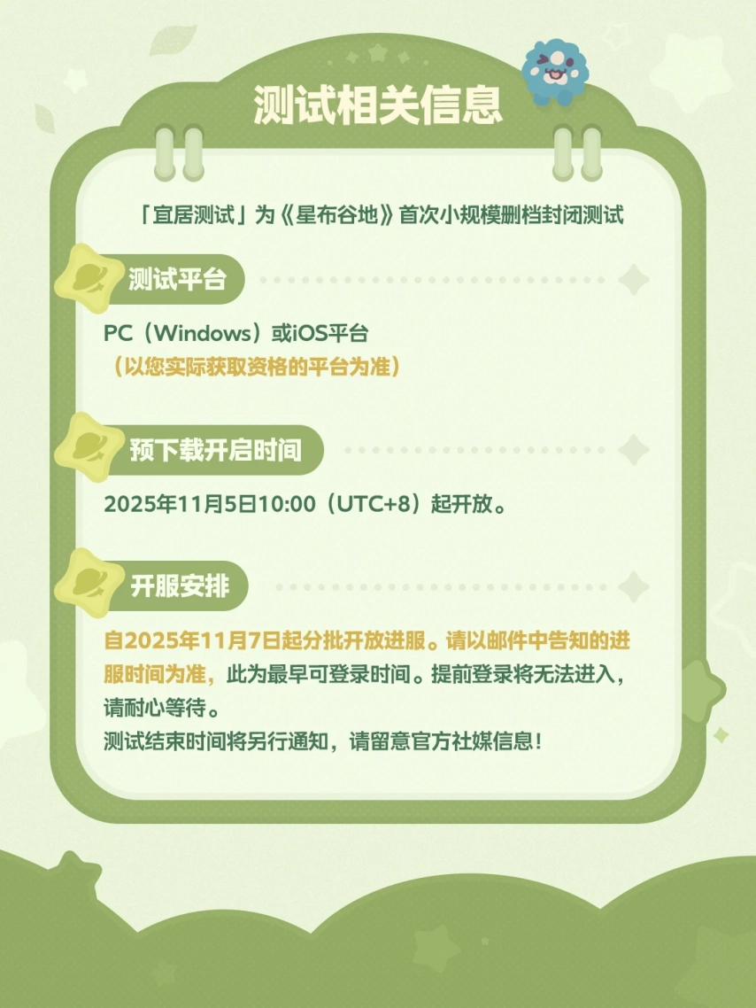 米哈游新作《星布谷地》的「宜居测试」资格,从2025年11月5日10:00开始陆续发放,同时游戏预下载通道也已开启。