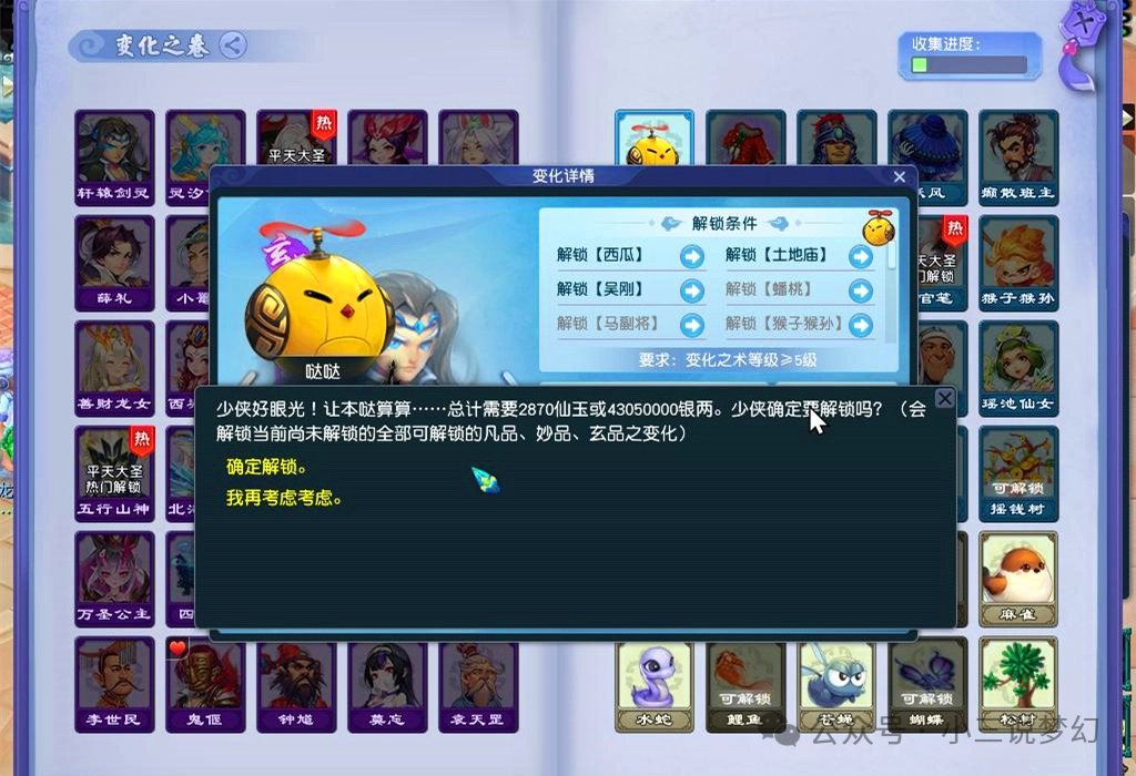 解锁72变系统里的卡片特别费时间,不过10月门派调整后新增了一键解锁功能,大概花4305万梦幻币就能解锁圣品以下的所有变化。不少玩家看到这4305万梦幻币会觉得贵,但换算成仙玉就划算多了——只需2870点仙玉,而且这部分仙玉完全可以用年卡赠送的免费仙玉抵扣,也就是说,玩家只要充一张年卡,就能解锁72变系统中圣品之下的所有变化了。