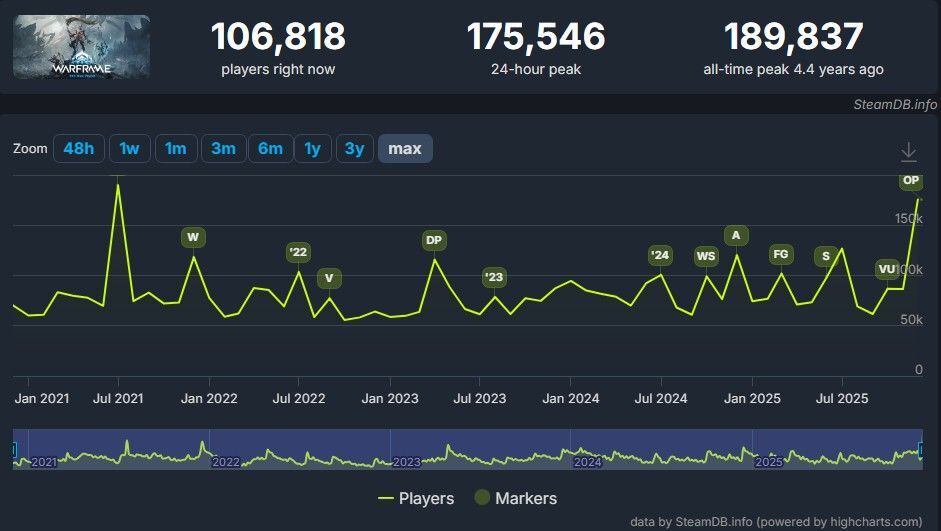 随着昨日更新上线,游戏创下了175,546的24小时峰值在线人数,这是自2021年7月以来的最高纪录。尽管新版本带来玩家峰值本是常态,但《Warframe》一般只有在提供免费奖励的TennoCon期间才会出现这样的涨幅。这次流量的大幅增加也使得许多玩家反馈服务器存在问题。