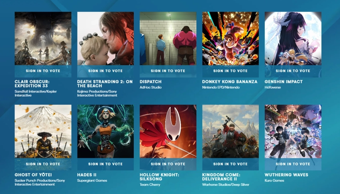 成功晋级第二轮的十款游戏名单如下:《羊蹄山之魂》《哈迪斯2》《空洞骑士:丝之歌》《天国:拯救2》《光与影:33号远征队》《死亡搁浅2》《超英派遣中心》《咚奇刚:蕉力全开》《原神》《鸣潮》。