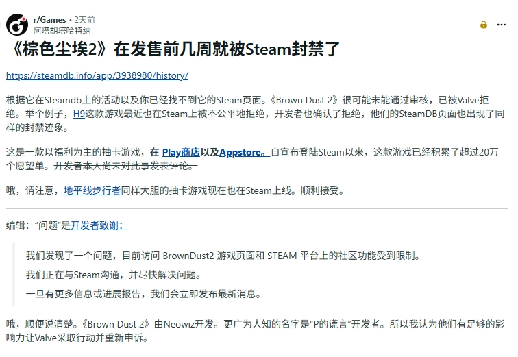 游戏发行商Neowiz已发布官方声明,证实Steam对《棕色尘埃2》的商店页面及社区功能采取了限制措施:“我们注意到一个问题,使得当前《棕色尘埃2》的Steam商店页面与社区功能受到限制。我们正与Steam方面保持沟通,全力推进问题的尽快解决。若有最新进展,我们会第一时间通知大家。感谢各位的理解与支持。”