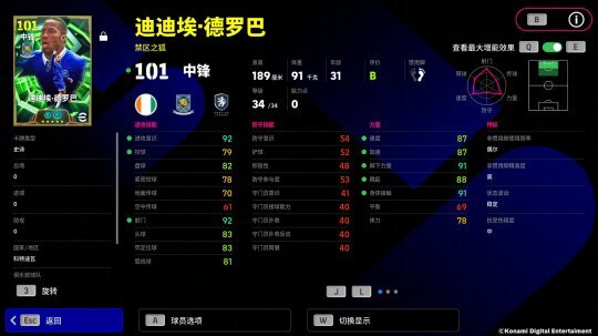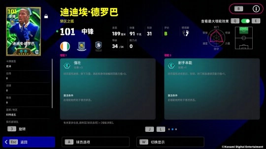德罗巴的增能属性是【强壮 +3】,速度与身体接触能力的提升,使得他那如同合金浇筑的身躯在进攻途中足以碾压所有阻碍!凭借【无定型射门】这一特殊技巧,即便处于背对球门的状态,他也能在转瞬之间拧身完成爆射破门!此外,他还自带【到位传球】的特殊技巧,总能送出手术刀般精准的传球,为队友创造得分良机!