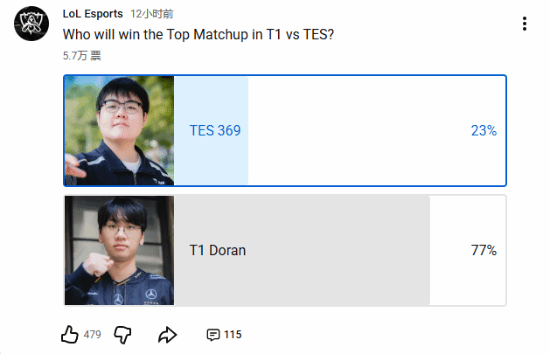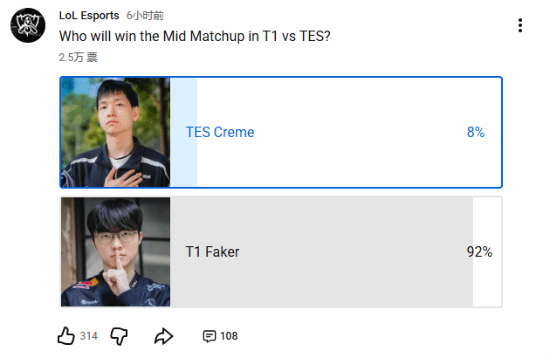 此外,官方也公布了T1与TES两队对位选手的投票结果,支持率依旧呈现一边倒的态势。