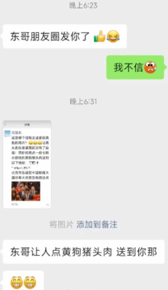 刘强东在朋友圈发文调侃自己被偷拍一事,他写道:“这是哪位现场的企业家朋友给我拍的照片呀?害得我以后在老婆面前都没自信了。罚你给我点一份七鲜小厨的黄狗猪头肉,记得送给邓聪冲。”