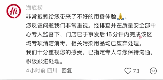 随后海底捞方面回应表示,在质量安全部中心专人的监督下,涉事门店已于事发后的15分钟内完成了该区域的专项清洁与消毒工作,所有相关的污染用品也都已做废弃处理。