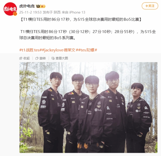 根据微博账号@虎扑电竞的信息,此次BO5的三局比赛时长依次是30分12秒、27分10秒和28分55秒,加起来总共86分17秒,成为了本届全球总决赛中耗时最短的BO5对决。另外,TES战队在面对LCK赛区队伍时,已经连续输掉了15个小局,这样的战绩确实不太理想。