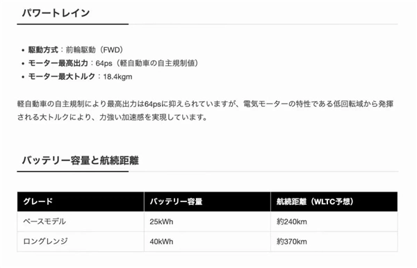 在配置方面,这款车配备了比日产、三菱同级别车型更大的25度磷酸铁锂电池,续航里程可达240公里,支持最高100kW的快充功能,甚至还配备了侧滑门,应对日本城市日常出行完全够用。如果消费者愿意增加预算,还可以选装40度的大容量电池,续航里程也会相应提升至370公里。