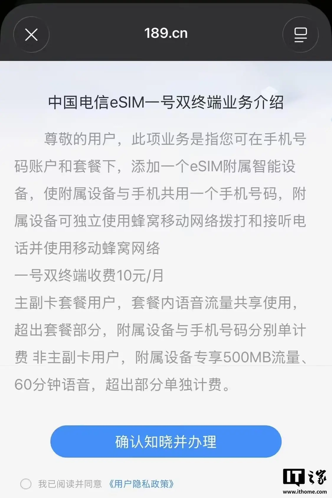 2021年6月1日及之后办理业务的用户,需缴纳一号双终端业务功能费,标准为每月10元。其中,安卓手表用户可通过中国电信App的“eSIM办理”页面完成办理;苹果Apple Watch用户则能够直接在手表端进行开通操作。