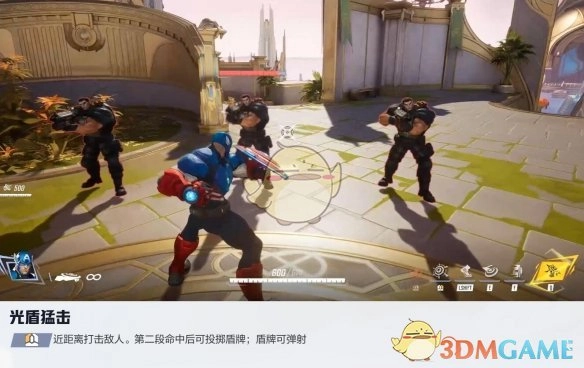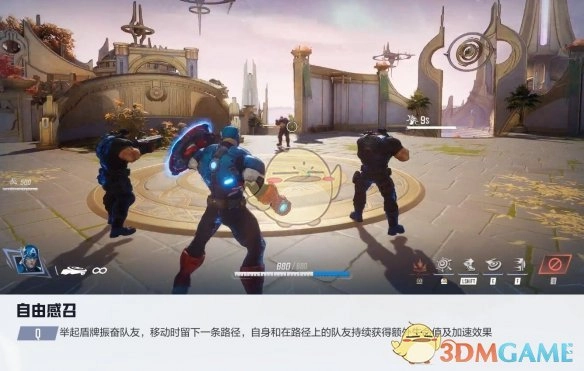 雷神对美国队长施加加护,使其移动速度得以提升,同时在其盾牌上附着雷电能量,用以电击敌人。