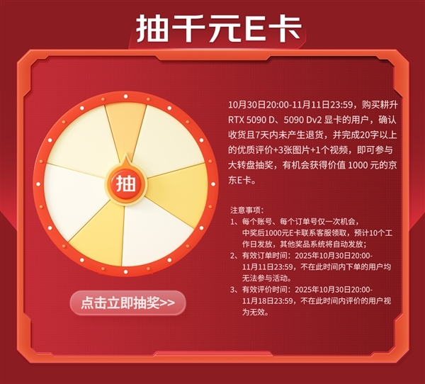 重磅福利抽千元E卡的活动还在火热进行中!本次活动面向耕升 RTX 5090 D、5090 Dv2 这两款旗舰显卡型号:只要在11月11日23:59前于耕升京东自营旗舰店下单这两款显卡,并且确认收货后7天内没有退货,同时发布20字以上的优质评价,附上3张实拍图和1个视频,就能参与大转盘抽奖,有机会赢取价值1000元的京东E卡!有效评价的截止时间是11月18日23:59,已经购买或者计划购买这两款旗舰显卡的用户,可别忘了这些时间节点,千元福利正在等着你!