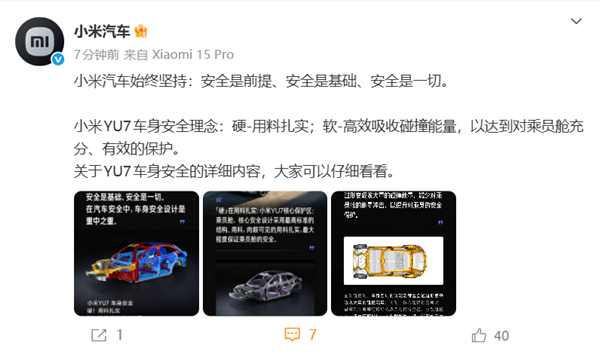 与此同时,小米汽车官方微博也发声称:“小米汽车自始至终秉持一个原则:安全是前提、安全是基础、安全更是一切的根本。”