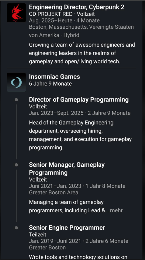 根据Jess Scott的领英资料,他目前在CDPR位于波士顿的工作室工作,而这个工作室正是负责续作开发的核心团队。