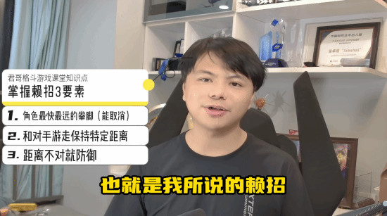 君哥归纳出“赖招”的三个要点:一是找出角色出招速度最快、攻击距离最远的拳脚招式;二是与对手周旋时维持特定的距离范围;三是一旦距离不在合适区间就立刻采取防御姿态。要是遇到对方也使用这种“赖招”的情况,那对方从地面逼近时就用蹲防应对,若对方从空中袭来则切换为站防。