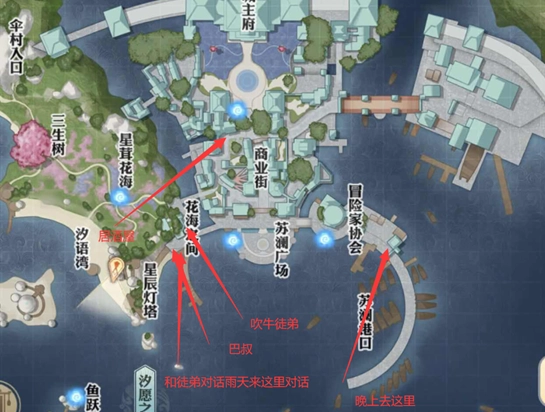 在坐标(526.329)处找到爱吹牛的徒弟梁思进,赶上下雨天的时候,前往坐标(529.307)与之对话。到了晚上,于港口坐标(810.291)碰面。等到夜里,前往图中特定位置进行探寻,届时会出现一只熊,与之对话后展开对局,取得胜利就能获取3个戏精碎片。