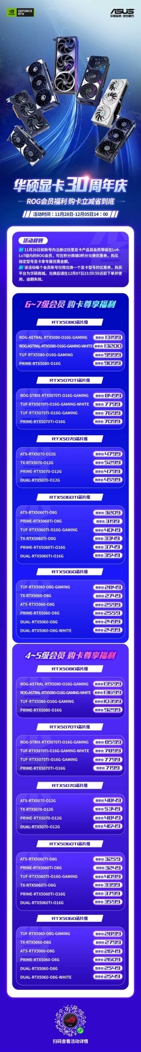 华硕显卡30周年庆典之际,也为广大玩家准备了丰厚的惊喜福利!ROG会员可专享升级显卡的超值立减优惠,活动时间为11月28日至12月5日14:00。具体活动规则如下:1. 若ROG会员在11月26日前的账号中注册过任意显卡产品,且会员等级处于Lv4至Lv7之间,即可在积分商城以0积分兑换优惠券,购买指定型号显卡时享受专属优惠额度。2. 每个会员账号在本次活动中仅能兑换一个显卡型号对应的优惠券,购买渠道限定为华硕商城。兑换成功后,请务必在12月7日23:59:59前完成下单并使用优惠券,逾期将自动失效。
