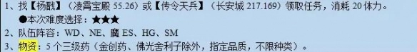 1、可在凌霄宝殿(55.26)处寻找【杨戬】,或者于长安城(217.169)找到【传令天兵】来领取任务,记得将难度选为3星,此任务领取需消耗20体力。
