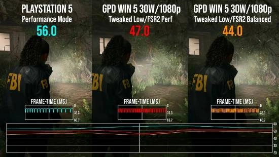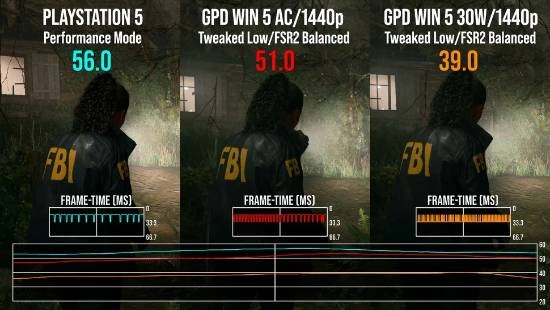 让GPD Win 5以满负载状态运行,用和PS5一致的设置(包括输出分辨率在内)来运行《心灵杀手2》。目标是在性能模式下达到60fps,这在PC平台上大概相当于低画质、中等物体密度设置,再通过FSR 2平衡模式输出1440p分辨率。GPD Win 5在功耗约70W时,帧率达到了PS5的93.5%(51.65fps对比55.25fps)。不过有意思的是,当把功耗降到30W以模拟合理的电池续航时,这个比例就下降到了PS5输出的69.6%。考虑到PS5从电源插座获取的功率要大得多,这样的结果已经相当不错了。