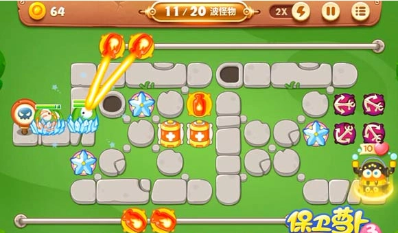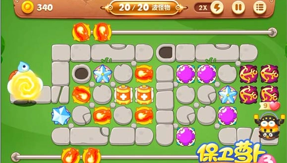 4、最后一波的布局参考图示,这一关的难度颇高,尤其是第16波和第19波的压力会成倍增加,所以萝卜的技能道具千万别吝啬使用。