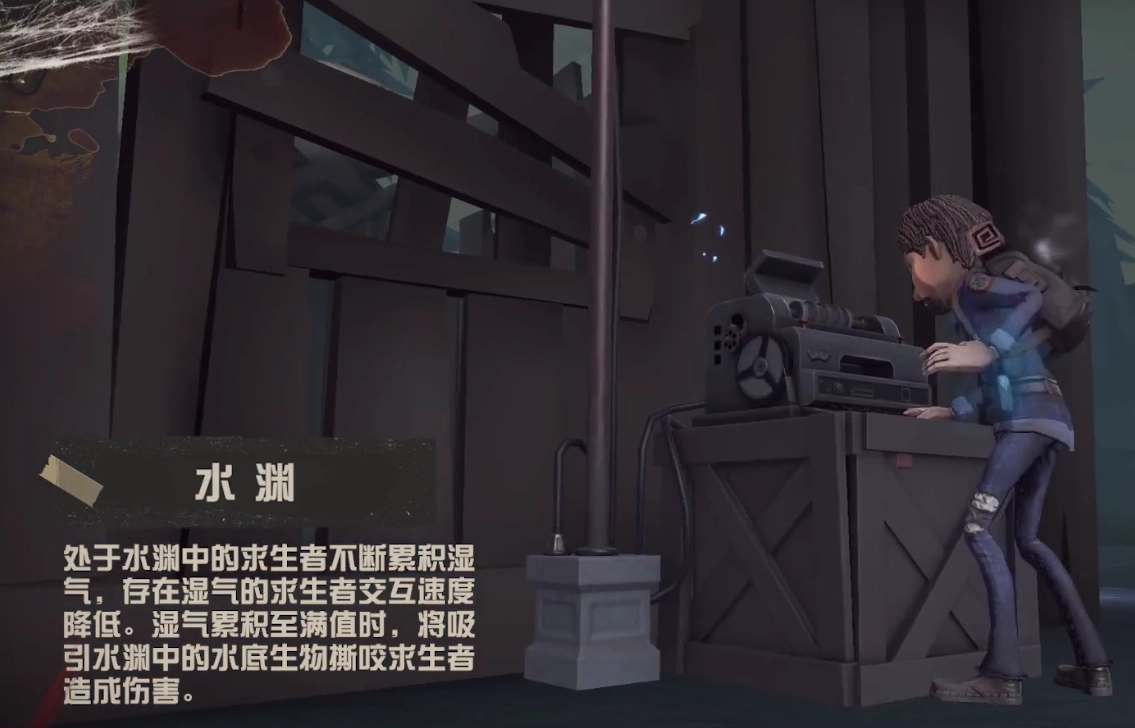 作为监管者的格蕾丝,拥有名为“至深之渊”的特质。当她行走时,脚下会留下小型水渊;若地上的水渊相互连接形成封闭空间,这片区域便会转化为大型水渊区域。处于该区域内的求生者会被施加湿气负面效果,不仅板窗交互速度与修机速度会下降,若在其中停留过久,还将受到一次伤害。