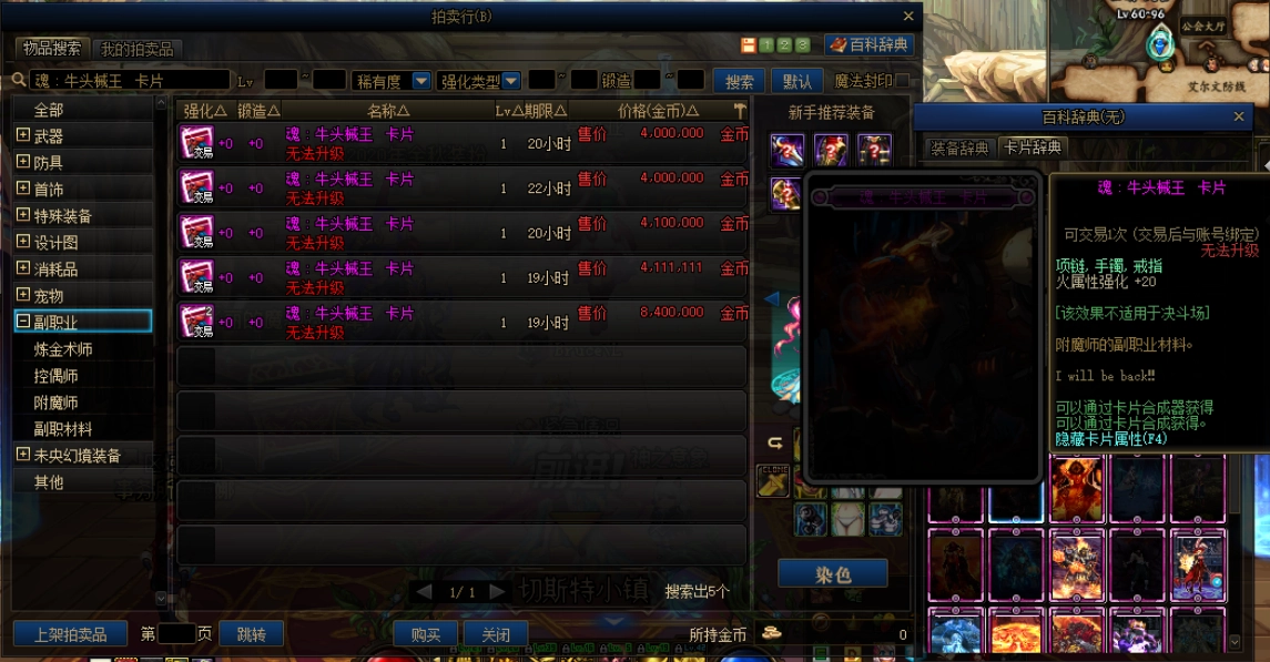 最后得说说最有名的“魂:虫王戮蛊”卡片了。因为远古图早就删掉了,这卡片现在几乎快成绝版货,我所在的大区里拍卖行都搜不到这张卡,只能用对应的宝珠来替代——毕竟大家都清楚,宝珠和卡片的价格本来就差不了多少。 这张卡片的属性是加45点物理攻击力,而国服玩物理系职业的玩家向来占多数,所以它的价格一直比同等级魔法系卡片高不少。估计老玩家都记得“8E卡”这个梗吧?当年这张卡就是用“8E卡”来调侃的,光听这名字也能想象出它以前有多贵。 不过现在版本里能替代它的好卡片太多了,所以它的价格也跌到了几百万金币,但即便如此,它在所有魂卡里面还是最贵的那一张。