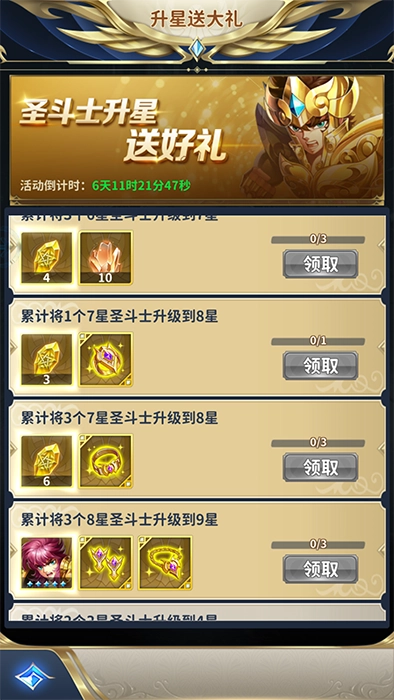 主要包含精彩活动里的升星送大礼活动,只要累计将3个8星圣斗士升级到9星,就能领取五星童虎;还有圣域集结活动,累计收集60名5星圣斗士,同样可以领取五星童虎。