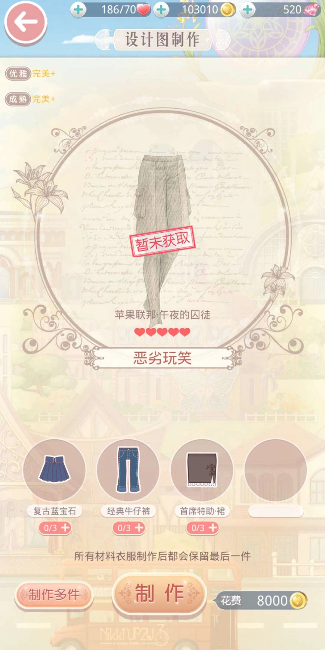 恶劣玩笑是通过设计图制作而成的优雅且成熟的裤子,制作该裤子需要用到3件复古蓝宝石、3件经典牛仔裤以及3件首席特助·裙。