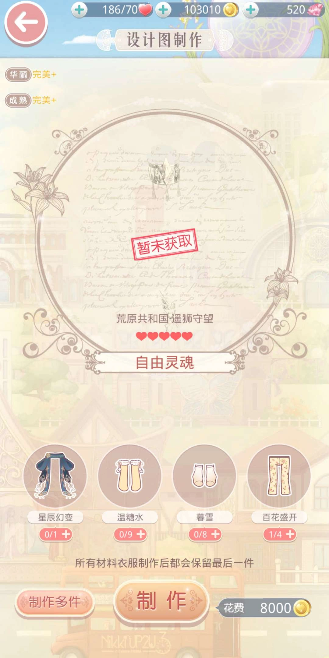 产自荒原共和国的自由灵魂是华丽且成熟风格的袜子,需通过设计图制作获取。制作该袜子所需材料较为复杂,其中获取难度最大的是同样需用设计图制作的星辰幻变,此外还需要9份温糖水、8份暮雪和4份百花盛开。
