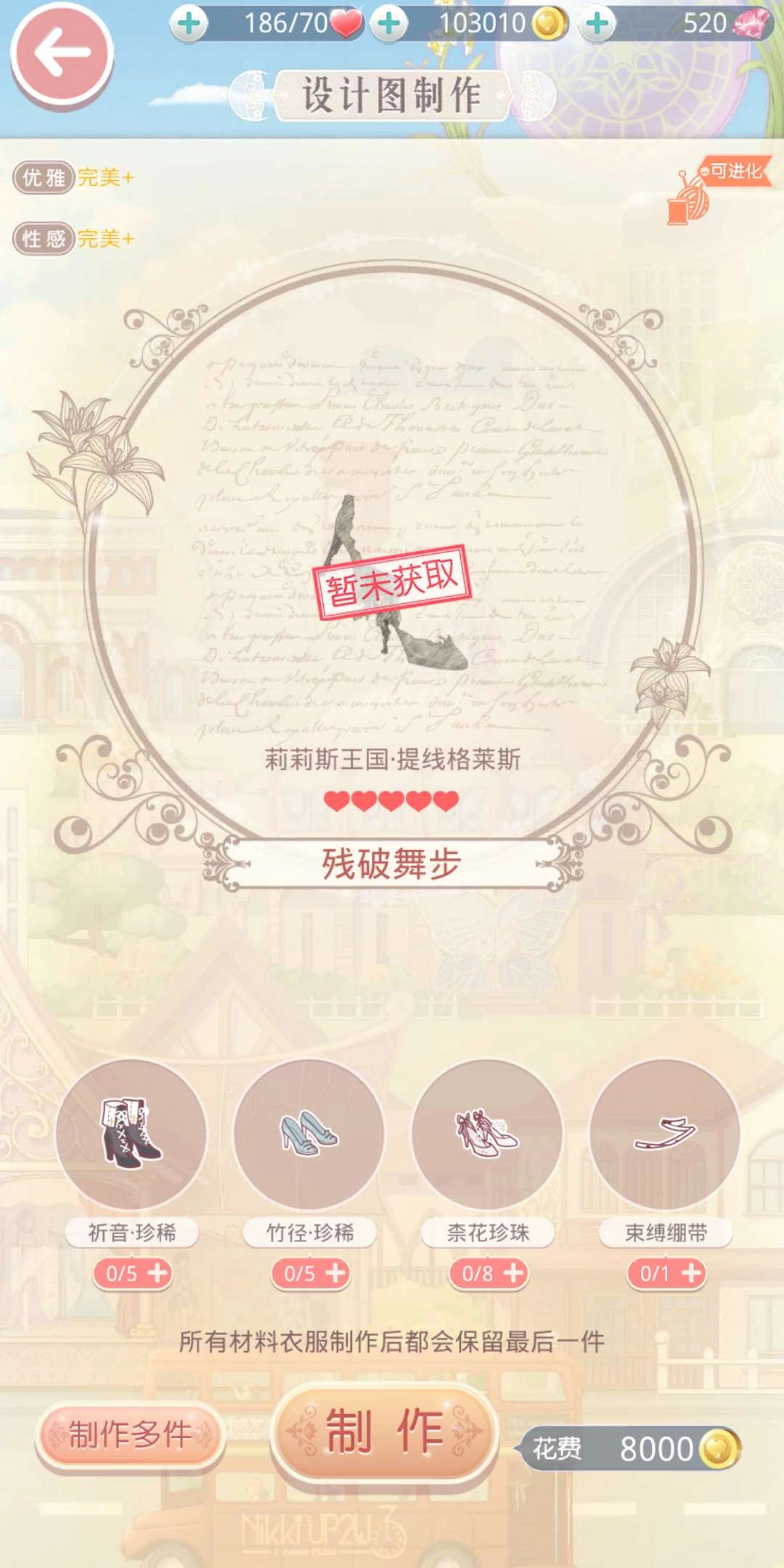 前面展示的都是华丽成熟风格的服饰,鞋子方面推荐一双兼具优雅与性感的“残破舞步”,这样能额外提升评分。“残破舞步”也是通过设计图制作的五星服饰,制作时需要用到5双祈音·珍稀、5双竹径·珍稀、8双柰花·珍珠,再加上一根束缚绷带。