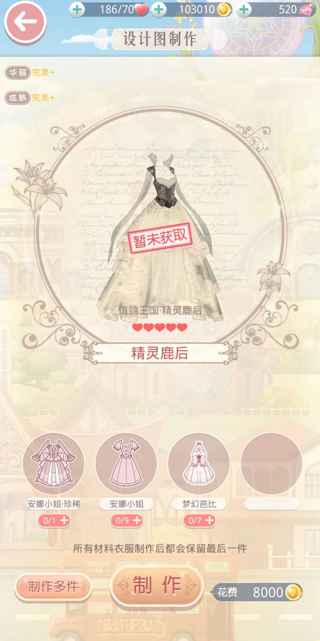 接下来为大家推荐一款连衣裙。这款名为精灵鹿后的服饰走的是华丽成熟路线,绘制设计图时,需消耗1件安娜小姐·珍稀、9件安娜小姐和7件梦幻芭比。尽管获取制作所需的材料相对耗费资源,但这条裙子能带来相当不错的分数收益。
