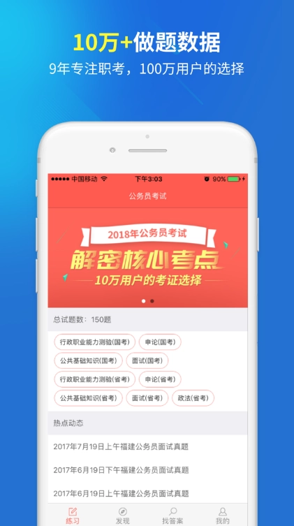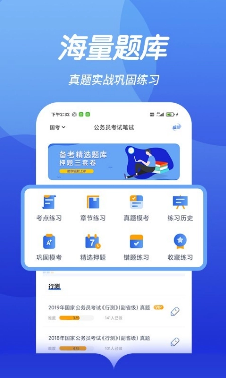 公务员考试对题库这款软件提供了历年各省的考试真题供大家选择练习,还设有模拟公务员考试功能,方便大家在学习过程中随时检测自己的实力水平。