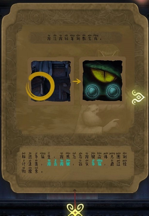 拿到钥匙后就能打开柜子,从中可以得到一件戏服和一个带锁的小盒子;同时在桌上能找到生肖密码的线索。接着,用之前从棺材那里获得的道具和玉镯子制作成一根粘性棍子,用它取下房顶上的照片。之后,玩家需要把得到的道具放进棺材里,再去后方的柱子上完成一个小游戏。等门口石墩子的游戏通关,就能点亮灯笼,在右侧灯笼处可获取一块勾玉。最后前往戏台,将捉到的萤火虫放置在戏台上。