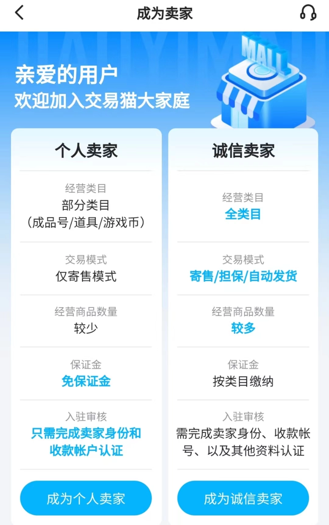 玩家在出售账号时,或许会担忧流程过于复杂,不过在交易猫平台卖号完全无需有此顾虑。交易猫的卖号门槛极低,玩家只需完成卖家身份认证,成为平台卖家就能上架账号。并且,交易猫为玩家提供了两种卖家身份选项,大家可以根据自身情况,自由选择成为个人卖家或诚信卖家。个人卖家无需缴纳保证金,仅需通过实人认证并绑定账户即可;诚信卖家虽然需要缴纳一定金额的保证金,但这类卖家更容易获得买家的信任,能够经营的商品数量和类目也更为丰富。