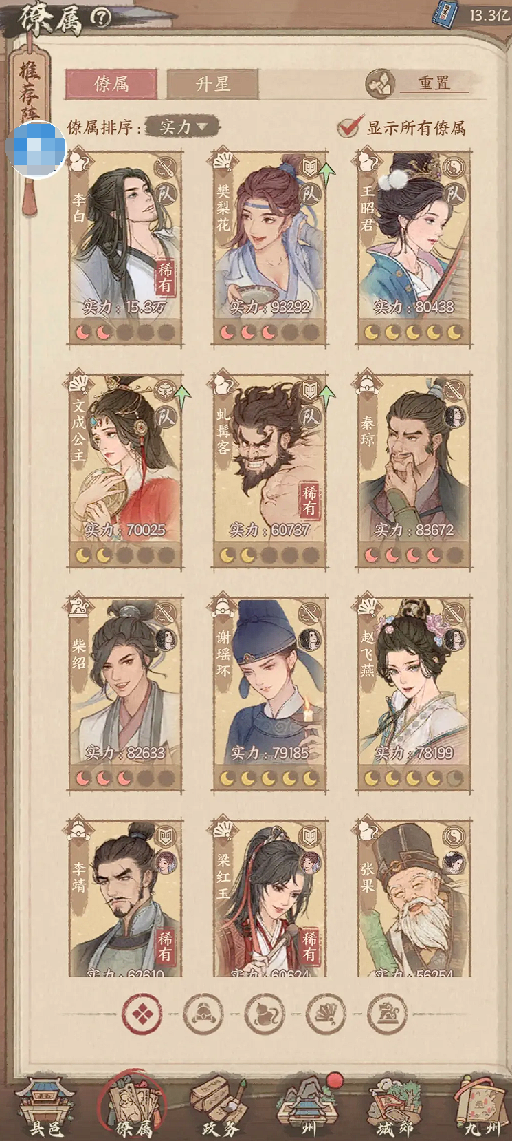 而且除了羁绊效果外,势力加成同样不容忽视。挑选僚属时,建议优先让同势力的角色一同上阵,以此获取势力加成,提升队伍的整体战力。文成公主是不错的辅助人选,她既能为团队带来治疗与增益效果,又和李白同属一个势力,能额外触发势力加成。