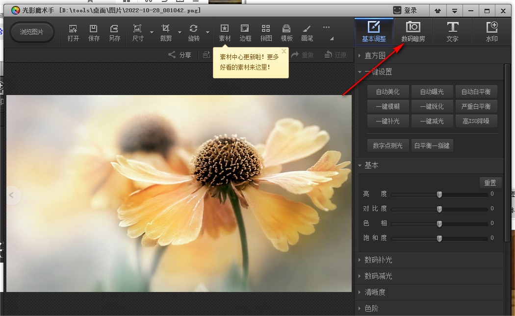 2. 图片成功导入后,请把鼠标移到右侧的【数码暗房】选项上并点击。