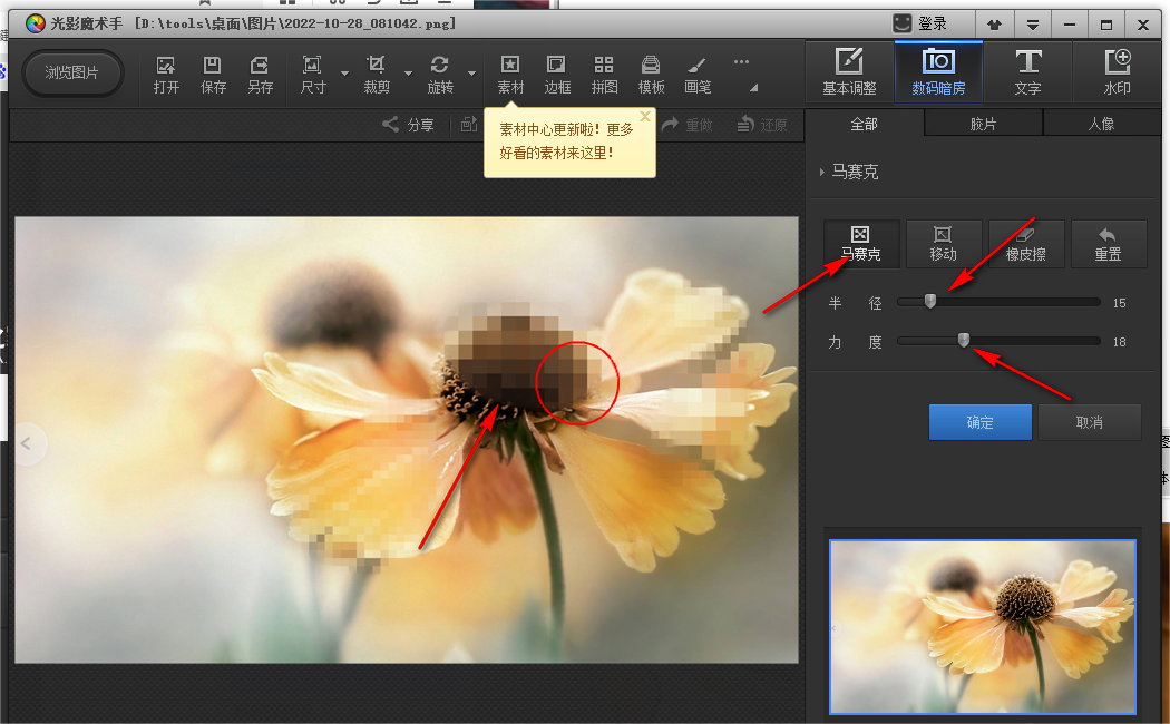4. 选定马赛克功能后,您能够对【半径】与【力度】这两个参数进行调整,从而实现您理想中的马赛克效果。要是您希望打造出朦胧的美感,可将【力度】参数往左侧调小。完成参数调整后,您就可以在图片上需要处理的位置使用马赛克了。