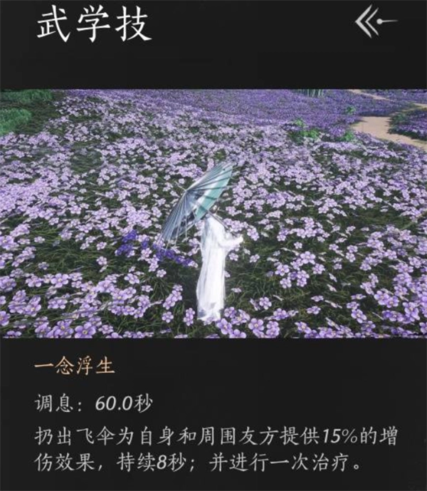 当切换至奶伞状态后,施展一念浮生技能,能为队友增添近20000的血量,同时赋予15%的增伤效果,该效果持续8秒。此技能堪称奶妈核心技能,一定要在队友输出的恰当时机使用。