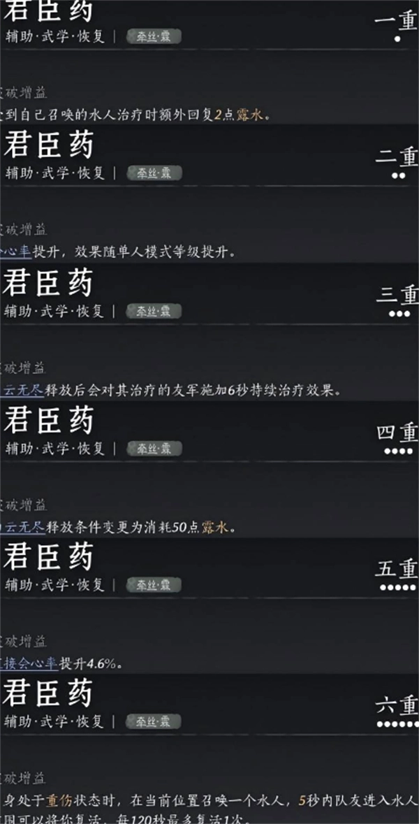 君成药:这是奶妈心法中的基础心法,能大幅提高治疗效果,重数越高,治疗效果越好。建议尽量堆到3层。